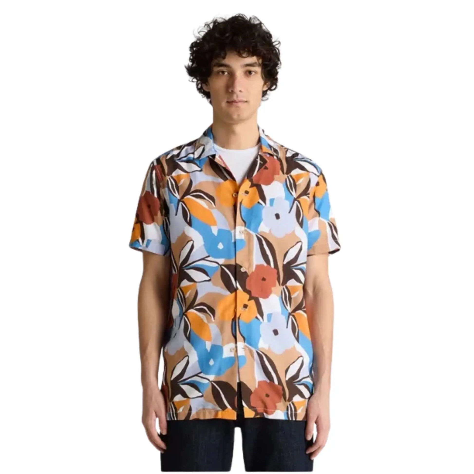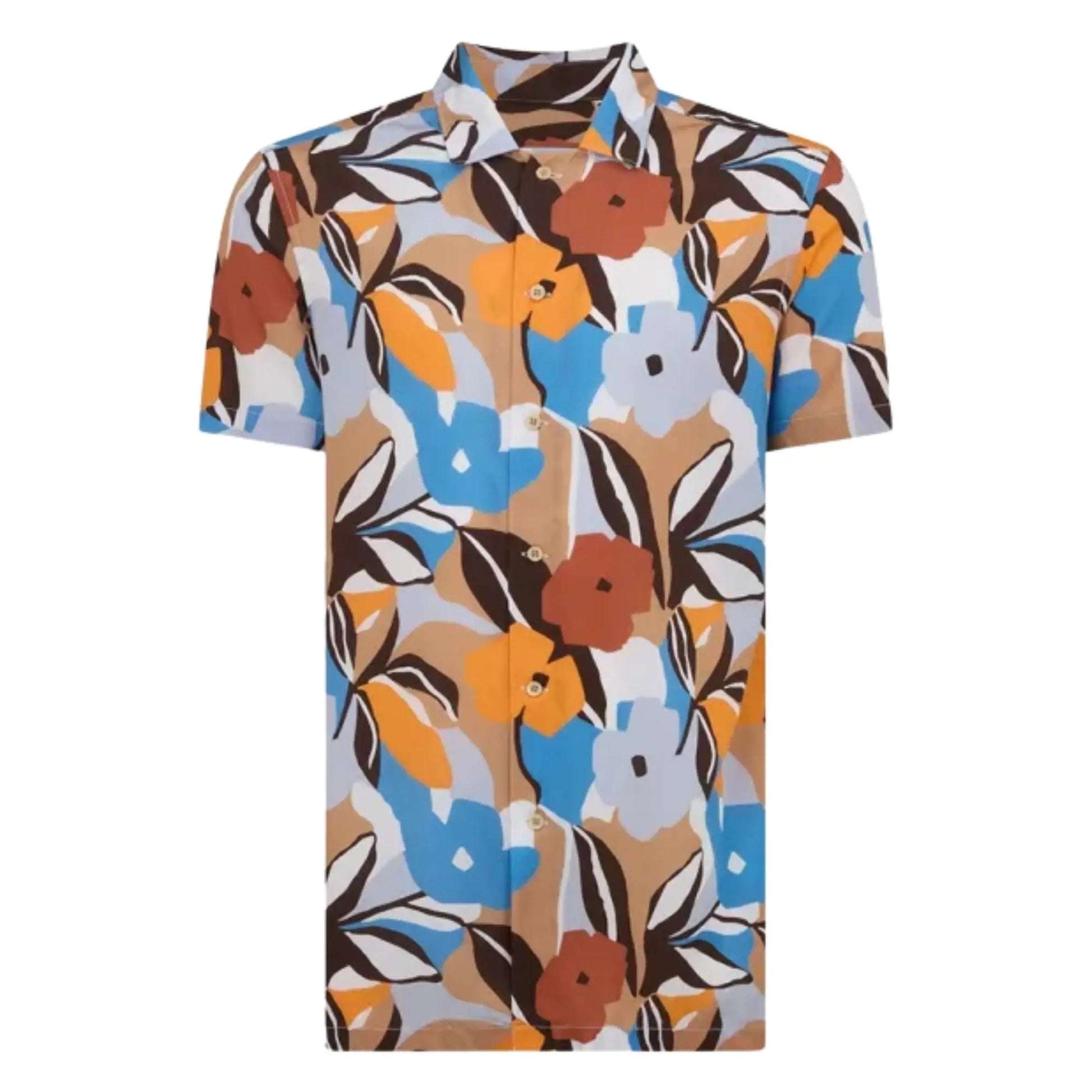 This abstract print short-sleeve shirt features a vibrant mix of bright blues, deep browns, and terracotta. With an open collar style, french front button down, and square hem, it's both stylish and comfortable. Perfect for adding a pop of color to any outfit.
