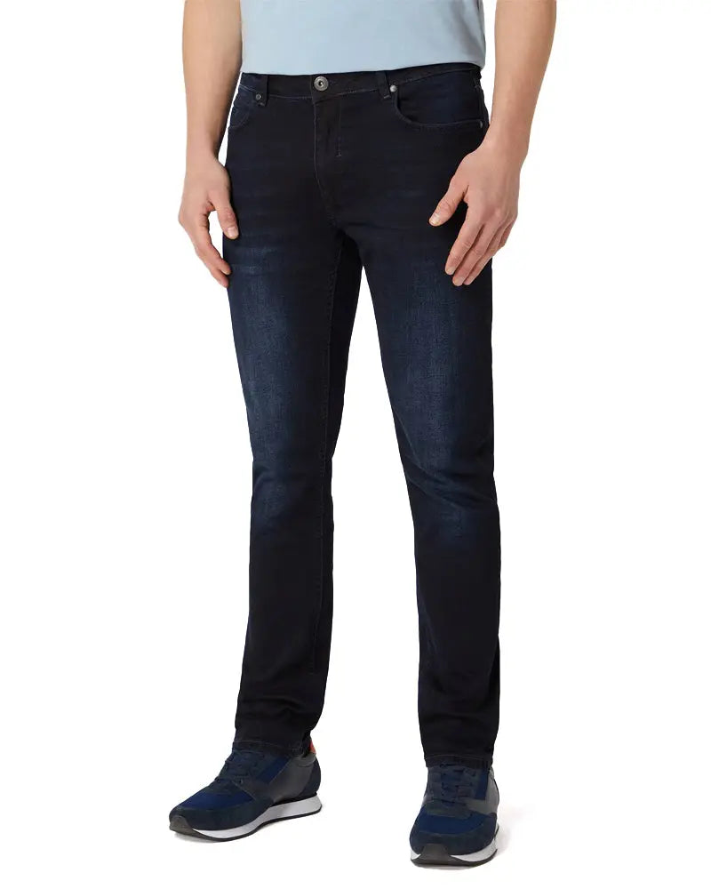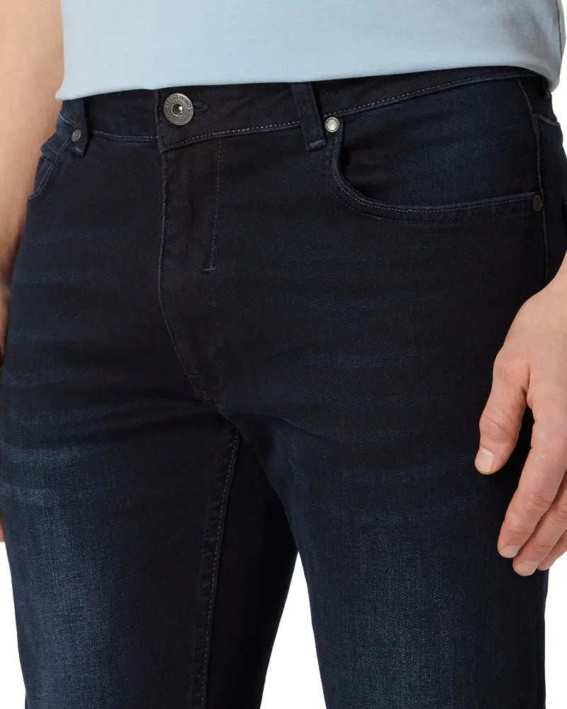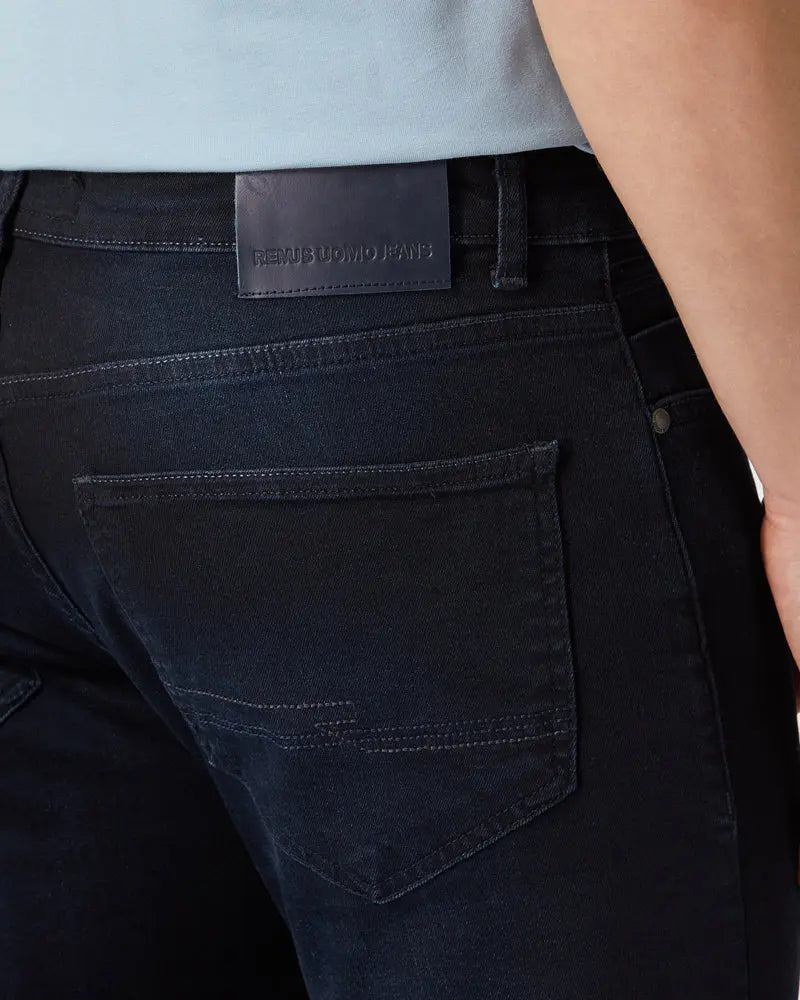 Remus Uomo Apollo Eco Fabric Jeans in Navy. Slim fit jeans designed to create the perfect slim silhouette with narrower profile through the leg and at the hem. These sturdy jeans feature a zip fly fastening with button closure, 4 pockets, patch branding and belt loops