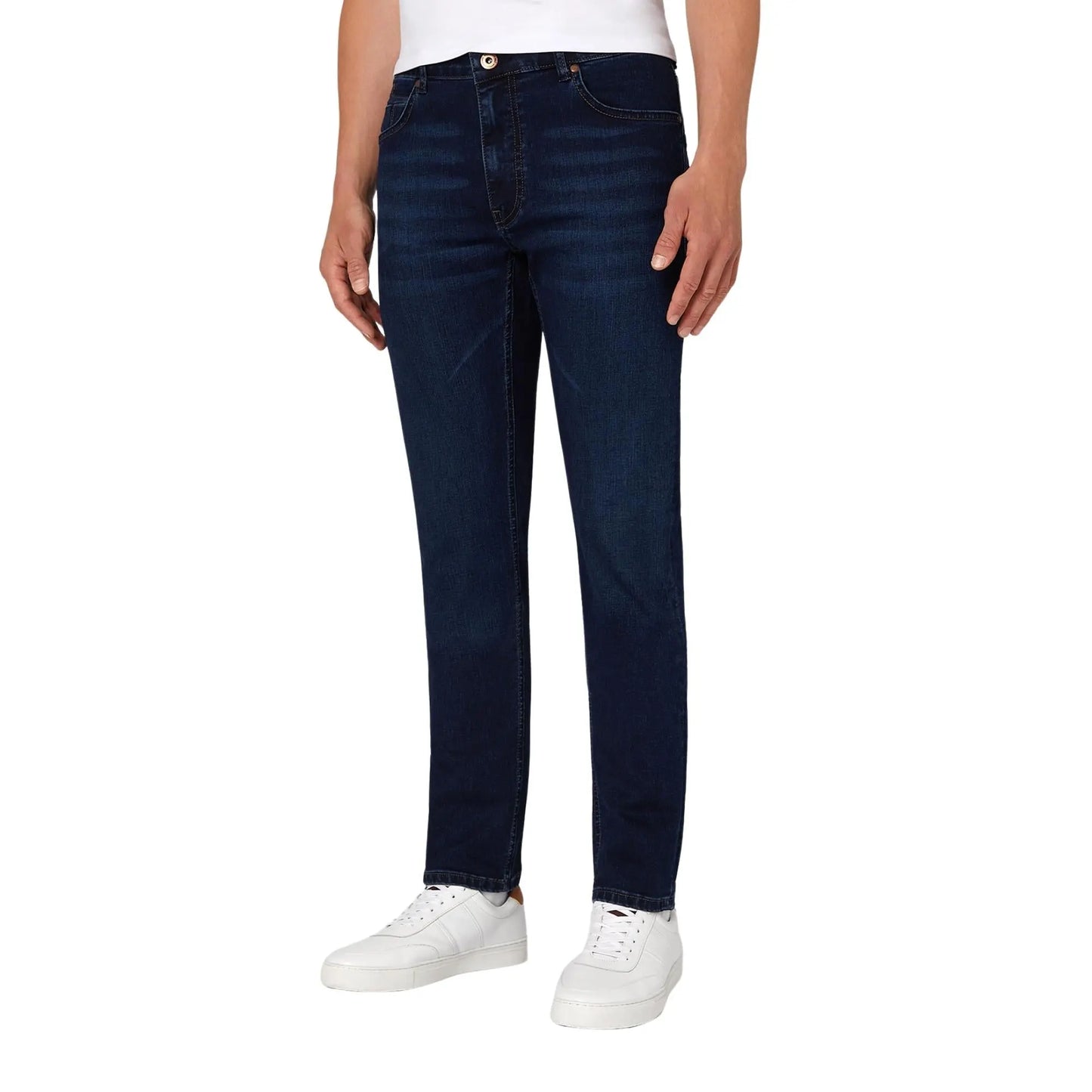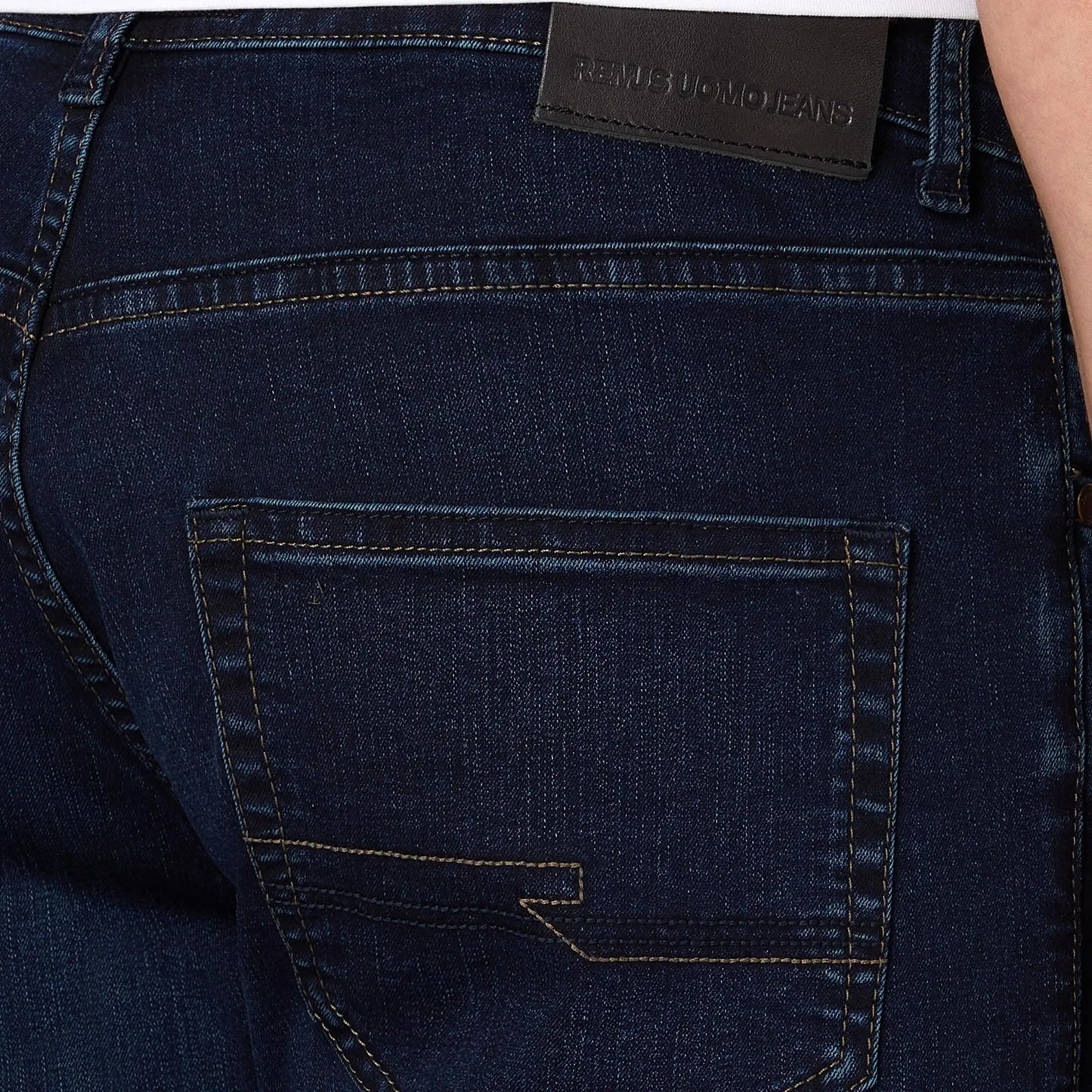 Remus Uomo Apollo Power Stretch Slim Jeans in Navy Denim. Power Stretch Slim Jeans in Navy Denim are tailored with a slim-fit silhouette for a comfortable yet polished style. Crafted with an advanced performance stretch fabric blend, this pair is engineered for durability and offers a narrower leg profile at the hem.