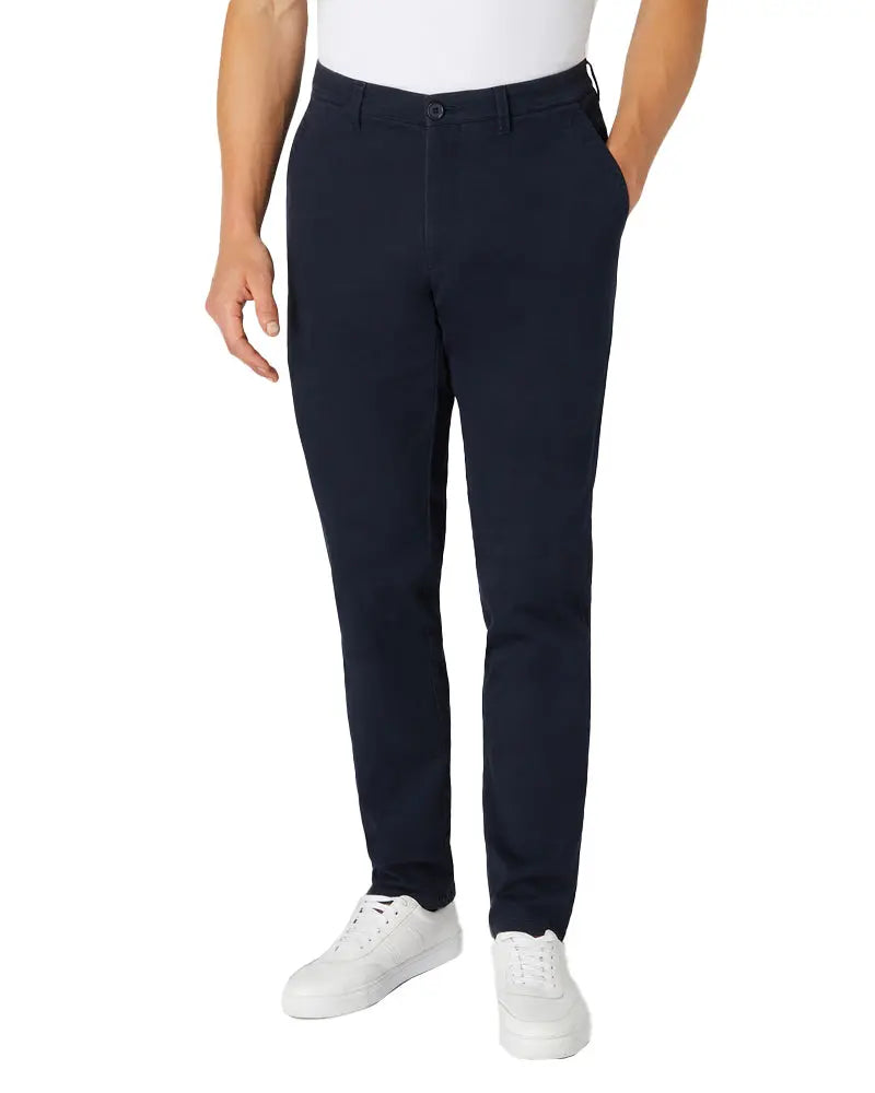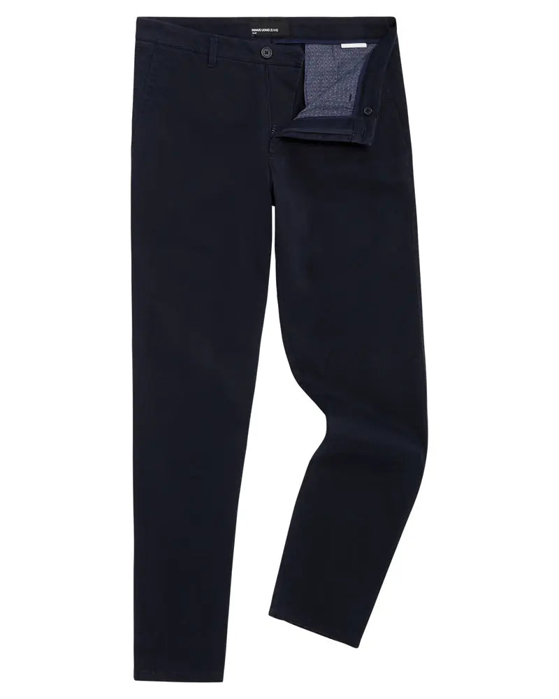 Remus Uomo Eldon Chino in Navy. Cut in a slim fit, these cotton chinos in a versatile navy colour way hold a slight stretch allowing for ultimate comfort whilst still being smartly dressed. The mid rise waistband is finished with zip fly fastening and two side entry pockets with a button to close.