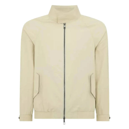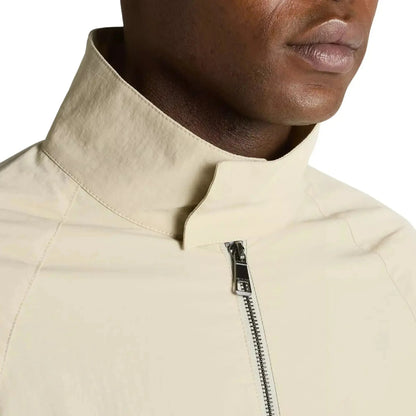 Introducing the Gabe Shower Proof Harrington Jacket in Stone. With a regular fit and showerproof nylon construction, this jacket is both stylish and functional. The stand collar and metal zip front provide added protection from the elements, while the raglan sleeves and envelope pockets add a touch of utility. Keep your belongings safe with the internal chest pockets and add a fashionable touch with the branded hardware.
