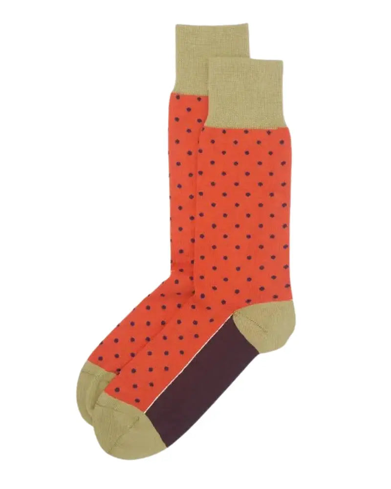 Peper Harow Polka Dot Design Cotton Socks in Orange. Adding style to your every day outfit has got a whole lot easier with these eye catching coloured socks with woven pattern and contrasting heel and toe. An extremely comfortable addition to any quirky sock collection and great for gift giving.