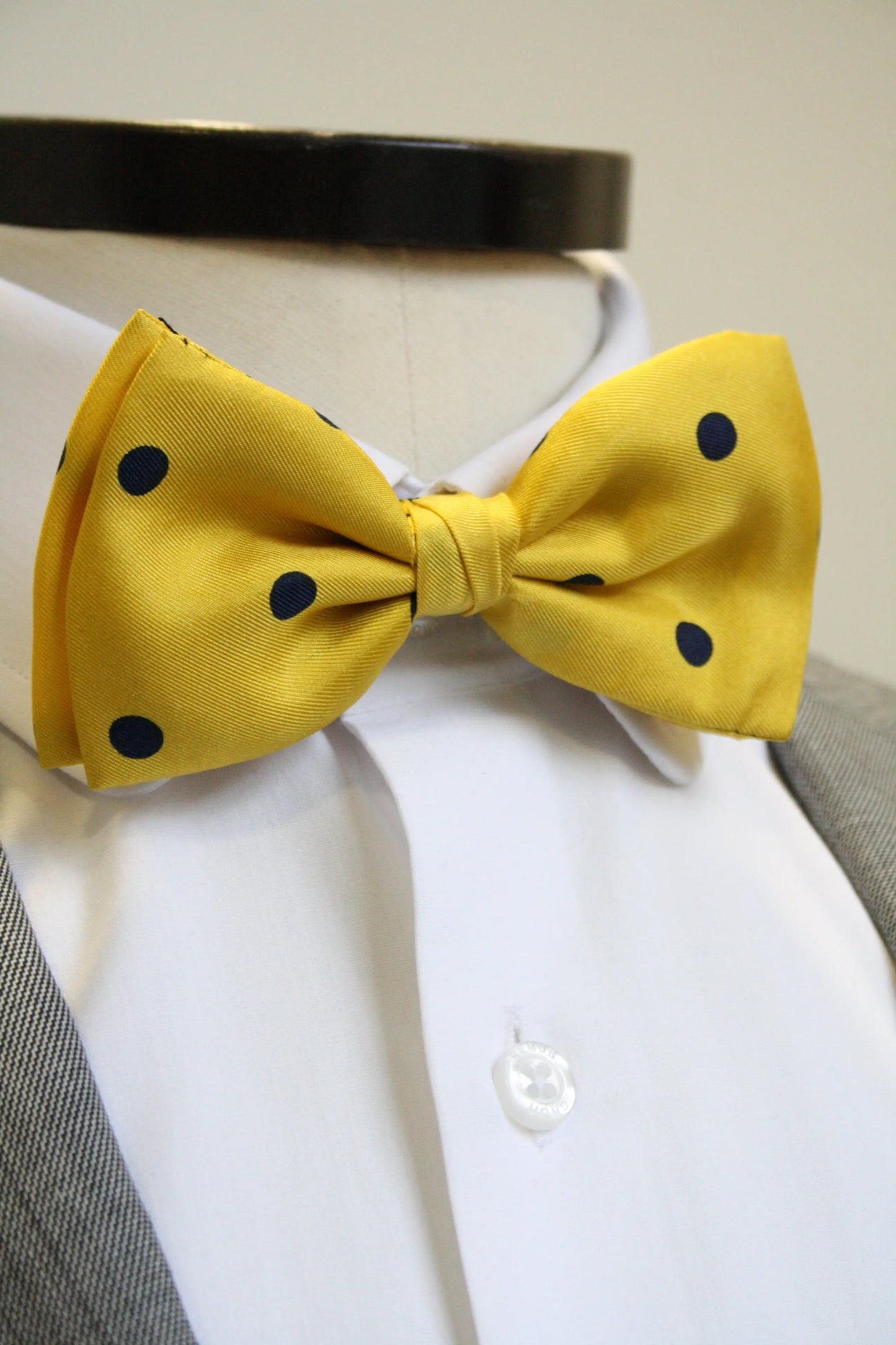 Yellow With Navy Polka Dot Silk Pre-Tied Silk Bow Tie